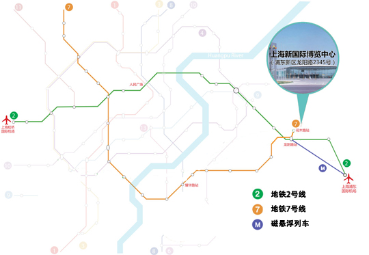 ? ?上海新國際博覽中心戰略性地坐落于浦東經濟開發區,距離上海新國際博覽中心600米處有一大型交通樞紐站,即龍陽路站(位于龍陽路上),包括多條路公交線路起點站、軌道交通2號線龍陽路站、軌道交通7號線龍陽路站以及磁懸浮列車終點站。從2號線龍陽路站步行到展館大約需10分鐘;從7號線花木路站步行到展館大約1分鐘。